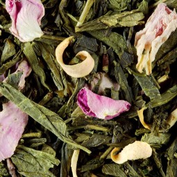 Thé vert Sencha, d’huile essentielle de bergamote, aux arômes de kiwi, de fleur d’oranger, pêche...